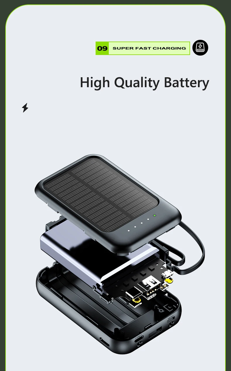 Features: With Solar Panel,With Flashlight,Built in Cables,Charger & Battery in 1